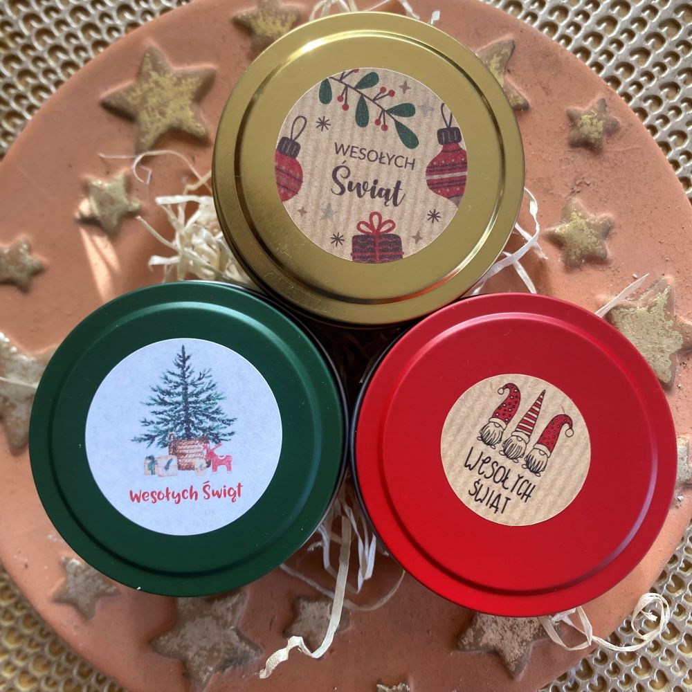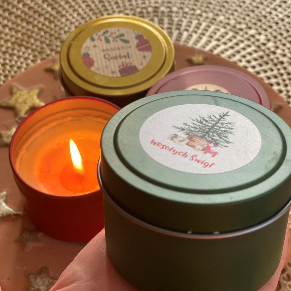 Eleganckie puszki w świątecznych kolorach i naklejki Wesołych Świąt sprawiają, że świeca staje się nie tylko źródłem światła, ale także piękną ozdobą i idealnym prezentem.