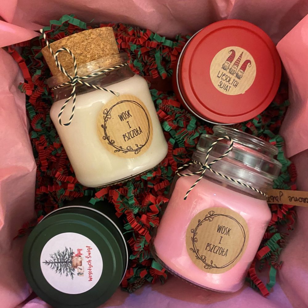 Podaruj bliskim wyjątkowy zestaw prezentowy, który łączy elegancję i świąteczną atmosferę. W pięknym pudełku znajdziesz dwie świece sojowe w szklanych słoikach oraz dwie w puszkach z napisem Wesołych Świąt. To gotowy, efektowny prezent, który zachwyci każdego obdarowanego i wprowadzi do wnętrza ciepło oraz magię świąt.